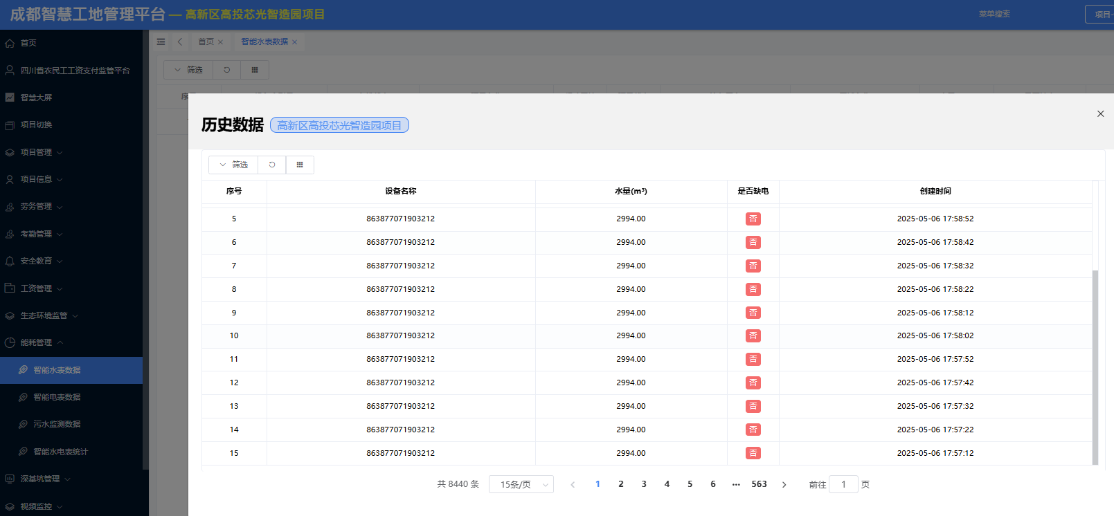 項目部通過智能水電監(jiān)測系統(tǒng),自動統(tǒng)計各區(qū)域一定周期內的用量,分析不同區(qū)域內的消耗量,采取針對性的環(huán)保措施,節(jié)約資源。
