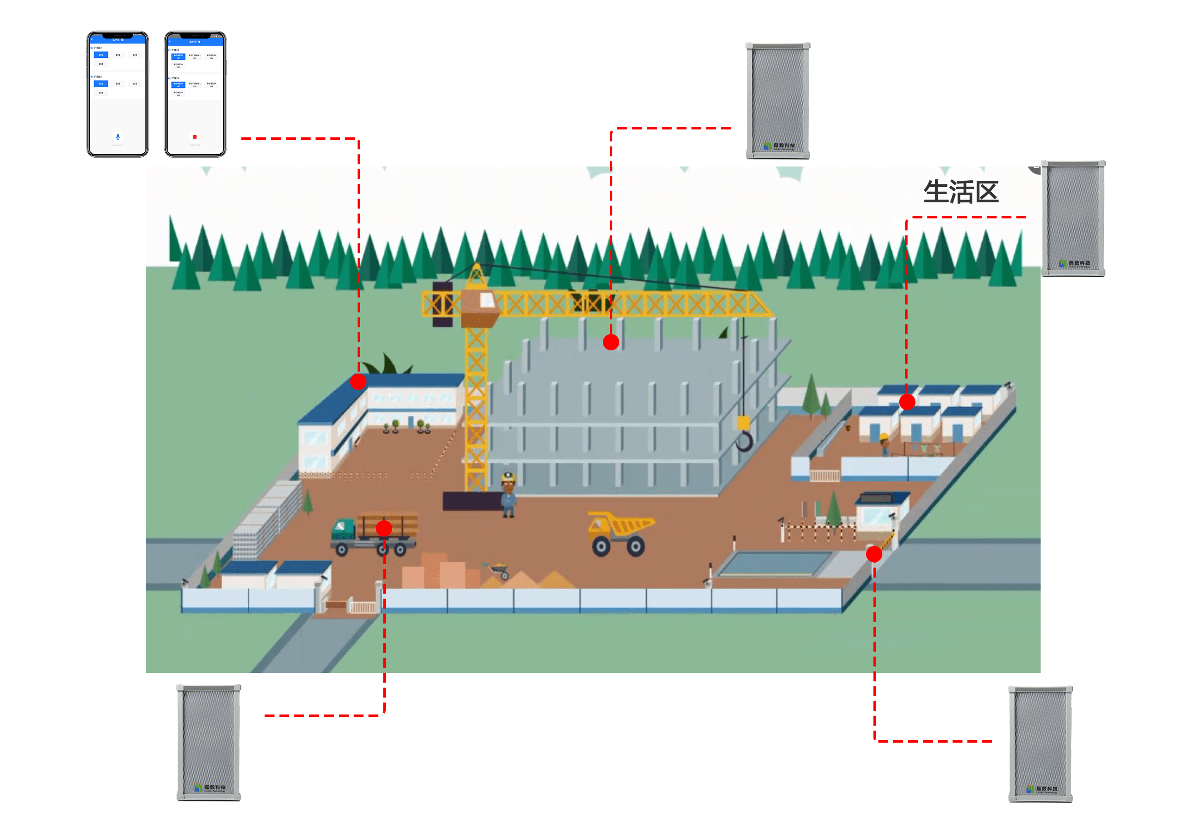 按生活區(qū)、作業(yè)區(qū)、塔吊覆蓋區(qū)、出入口等劃分廣播分區(qū),支持單點、分組、全區(qū)三種模式,避免"一喊全工地"。 -